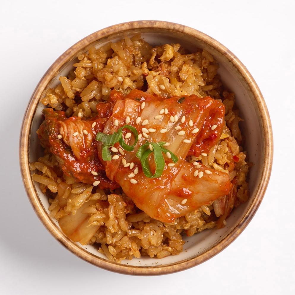 Arroz hervido salteado al wok con nuestro kimchi y salsa especial, acompañado de un huevo frito y cebolleta.