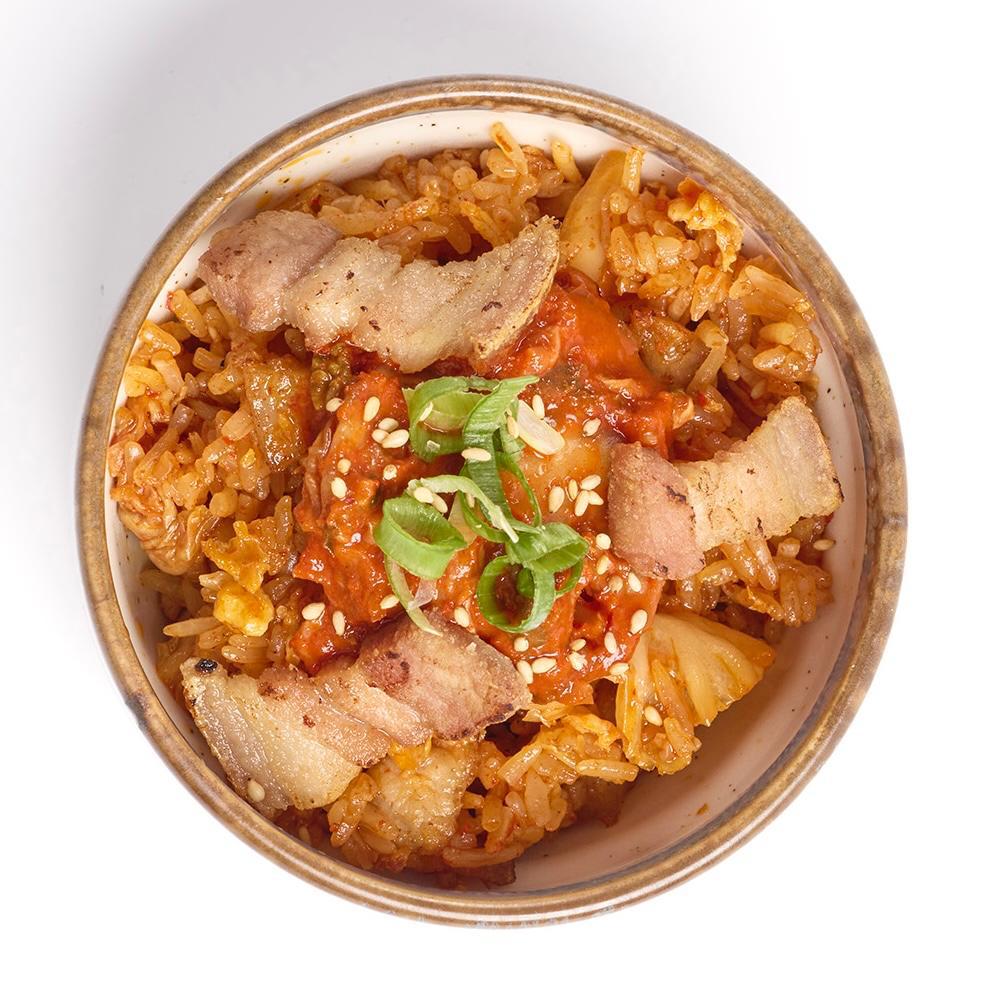 Arroz hervido frito al wok con panceta crispy, toque de kimchi casero, salsa especial y huevo un frito.