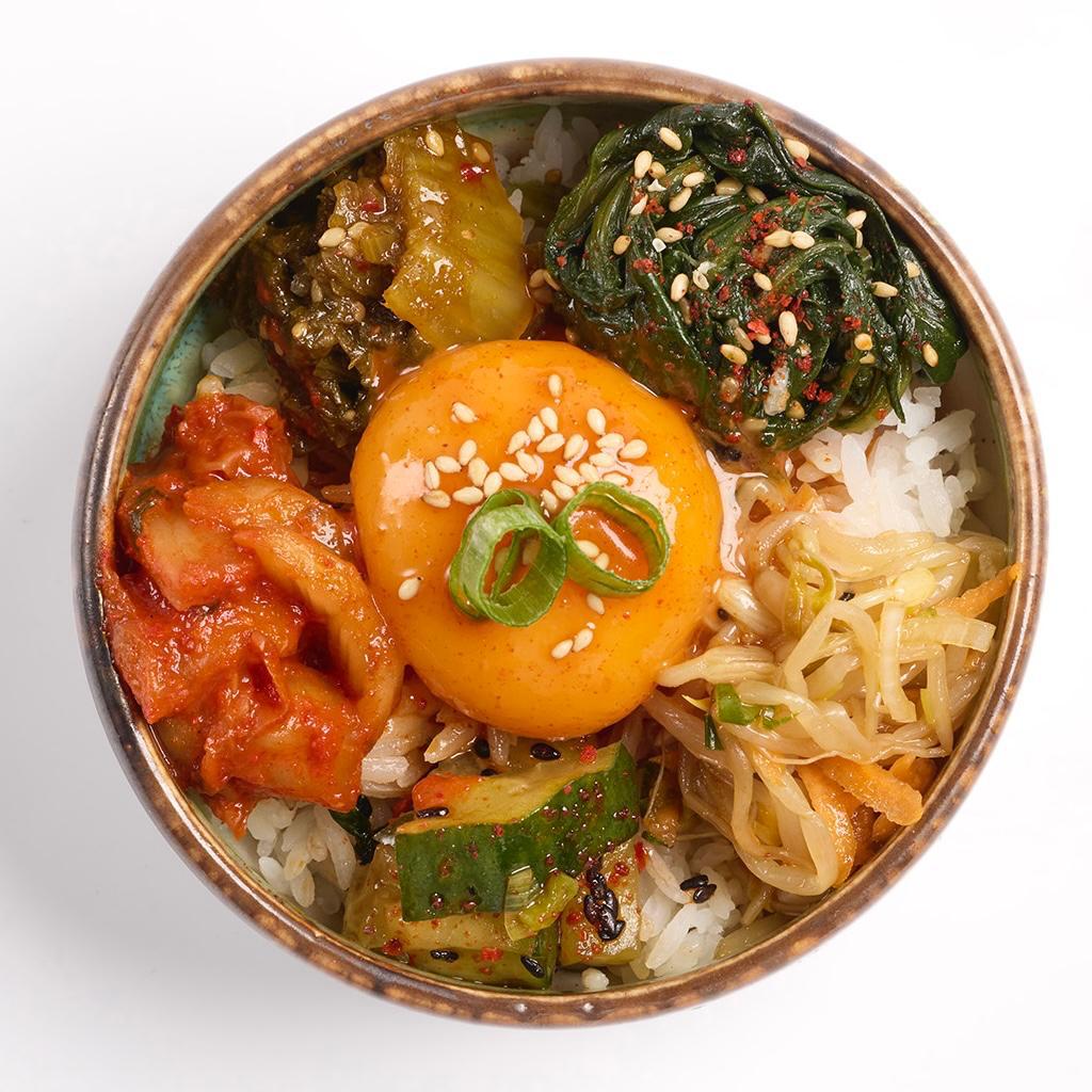 Famoso arroz coreano cocido a la cazuela acompañado de un huevo frito y múltiples vegetales con salsa agripicante.