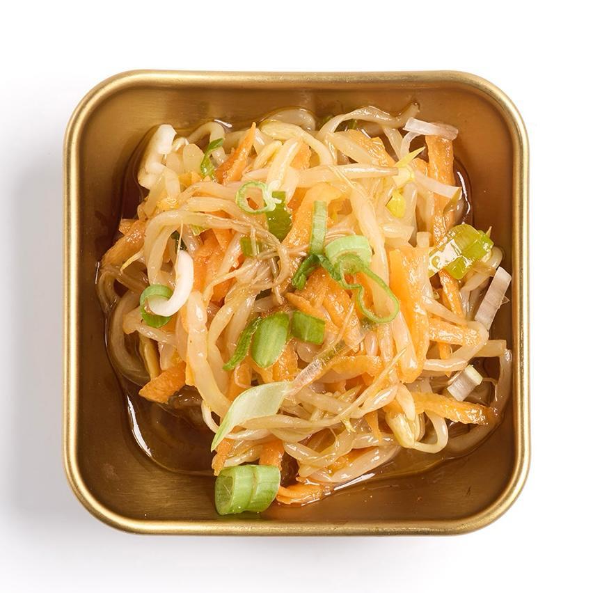 Brotes frescos de soja hervida al vapor aliñadas con zanahorias encurtidas y toque de soja y sésamo.