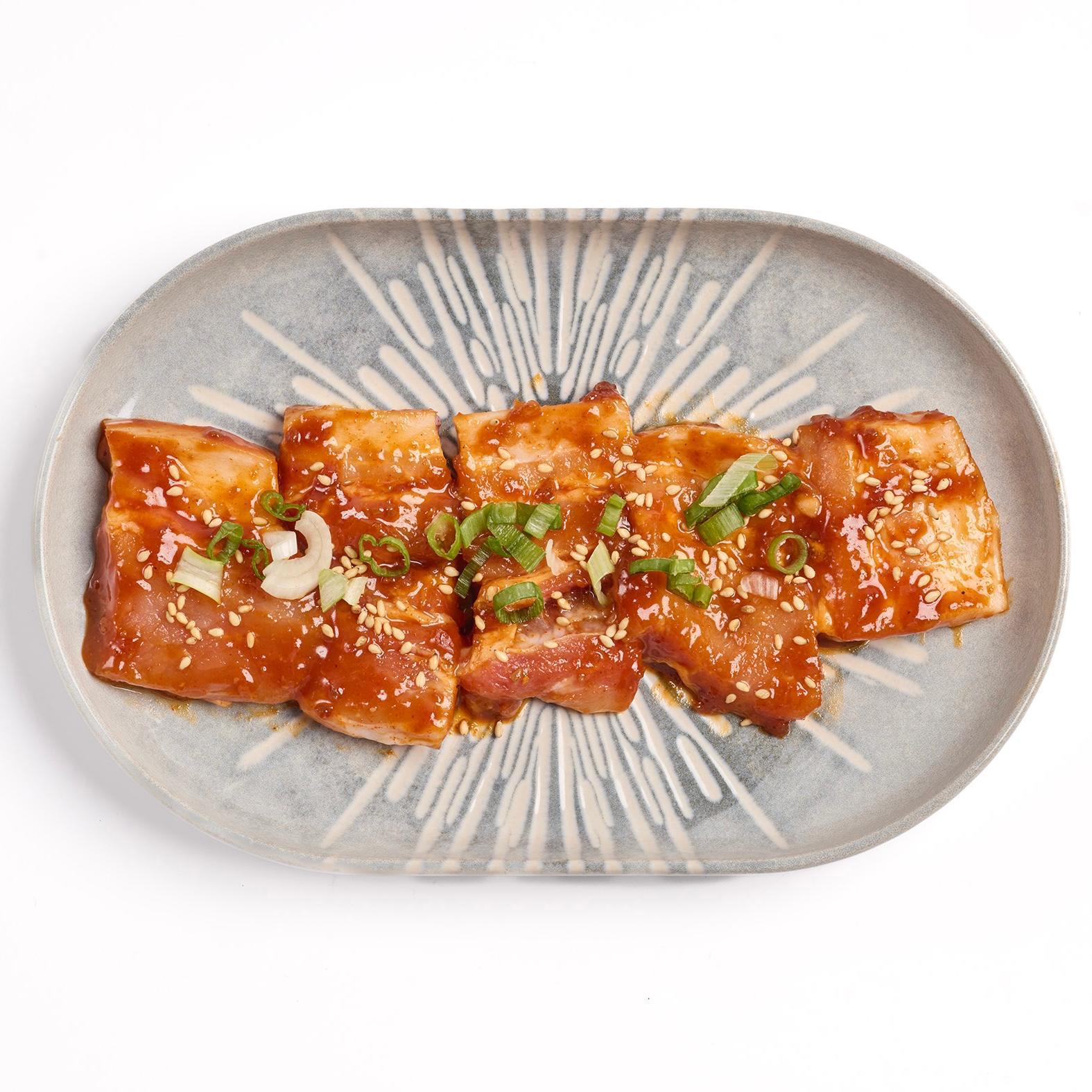 Tiras de panceta de cerdo seleccionada, maceradas en nuestra salsa bulgogi especial y servidas con rodajas de cebolla para potenciar su sabor.