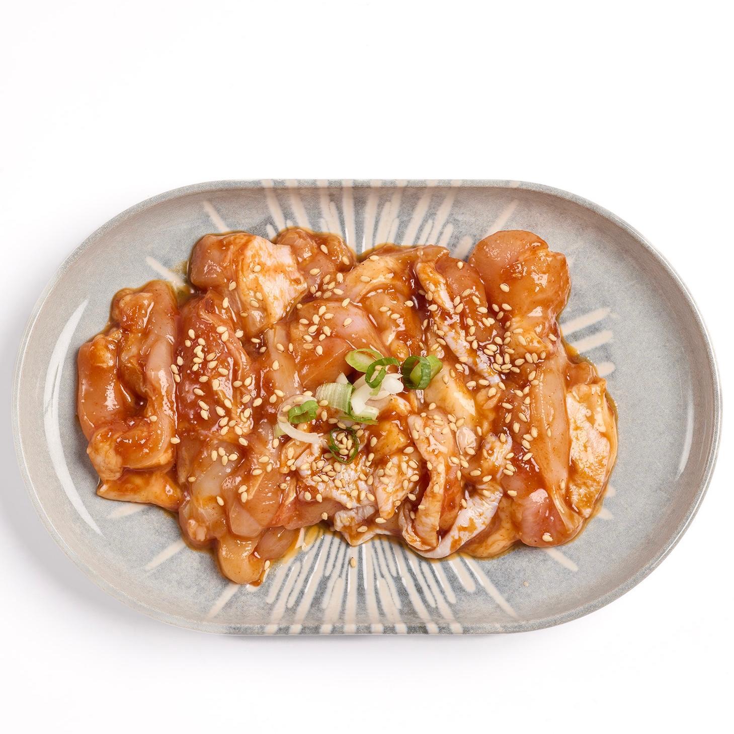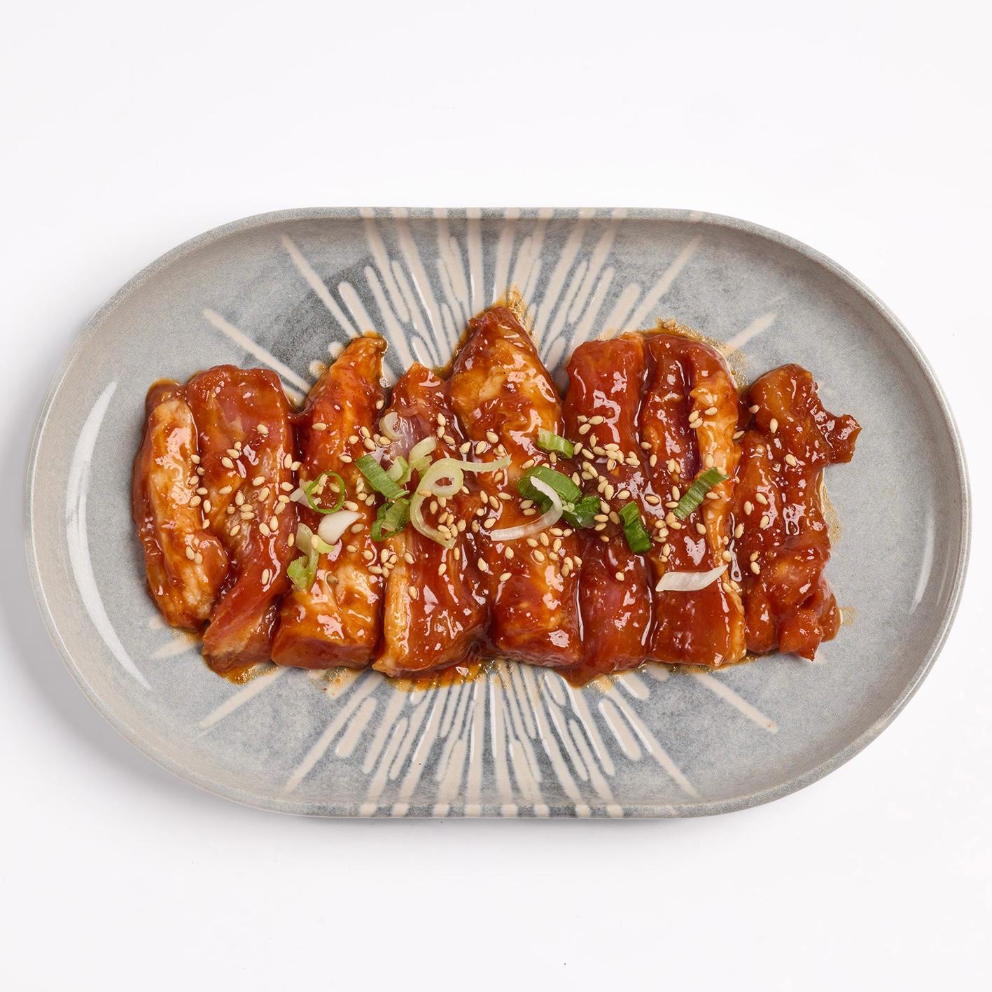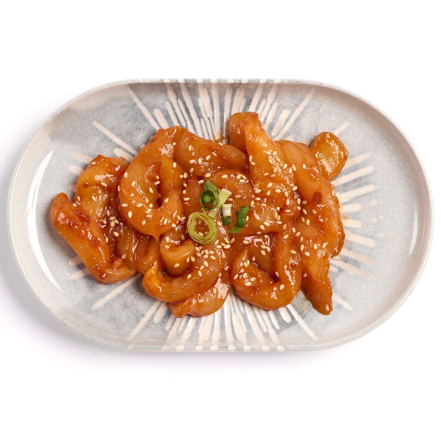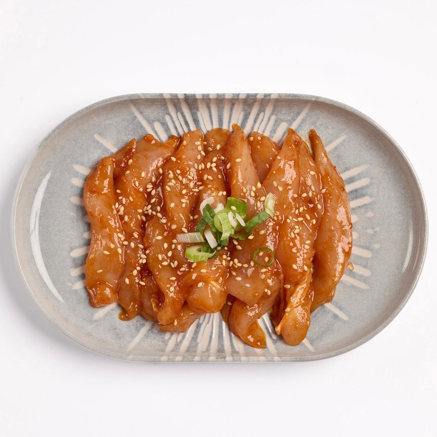 Finas tiras de pechuga de pollo de corral, marinadas en nuestra salsa bulgogi especial y acompañadas de cebolleta tierna.