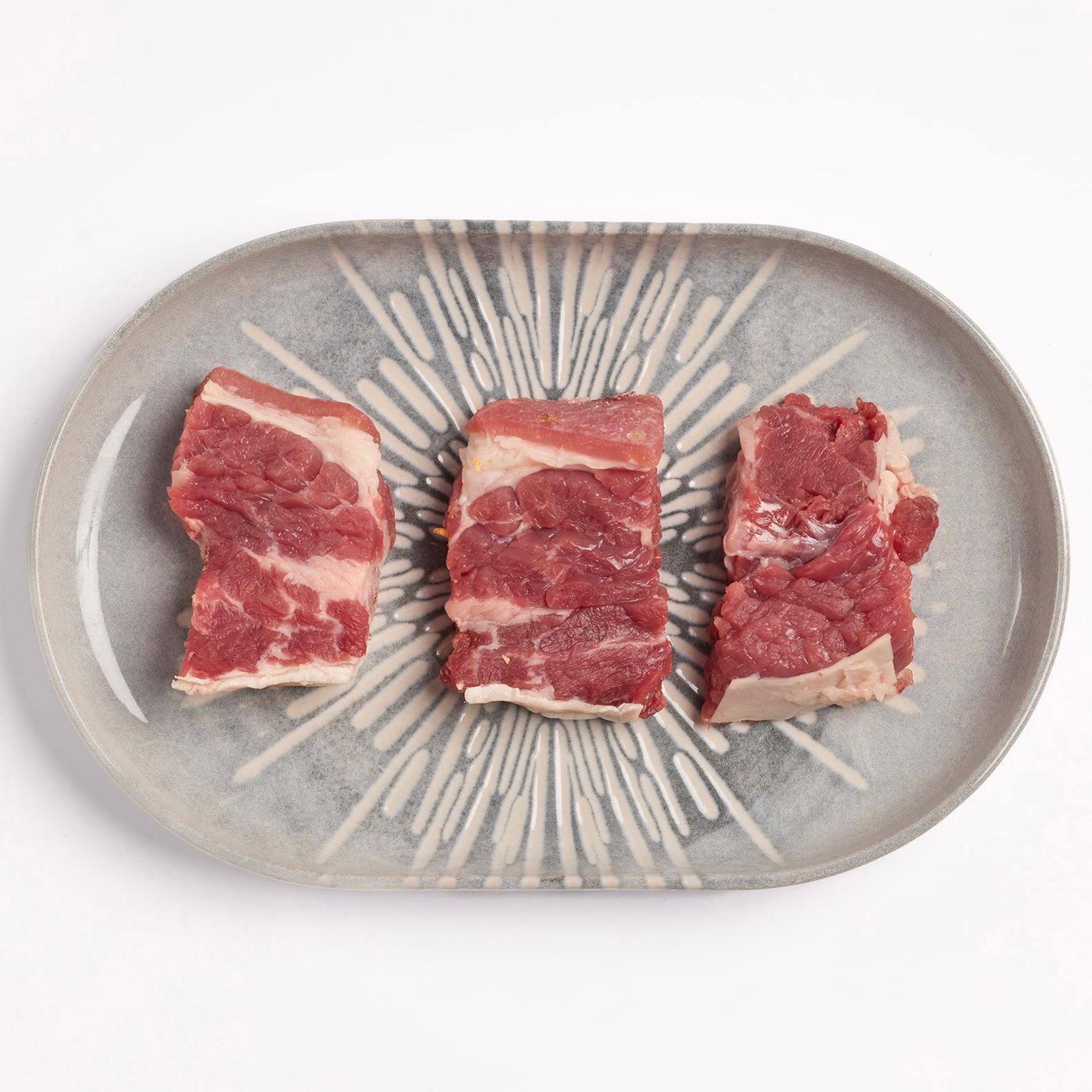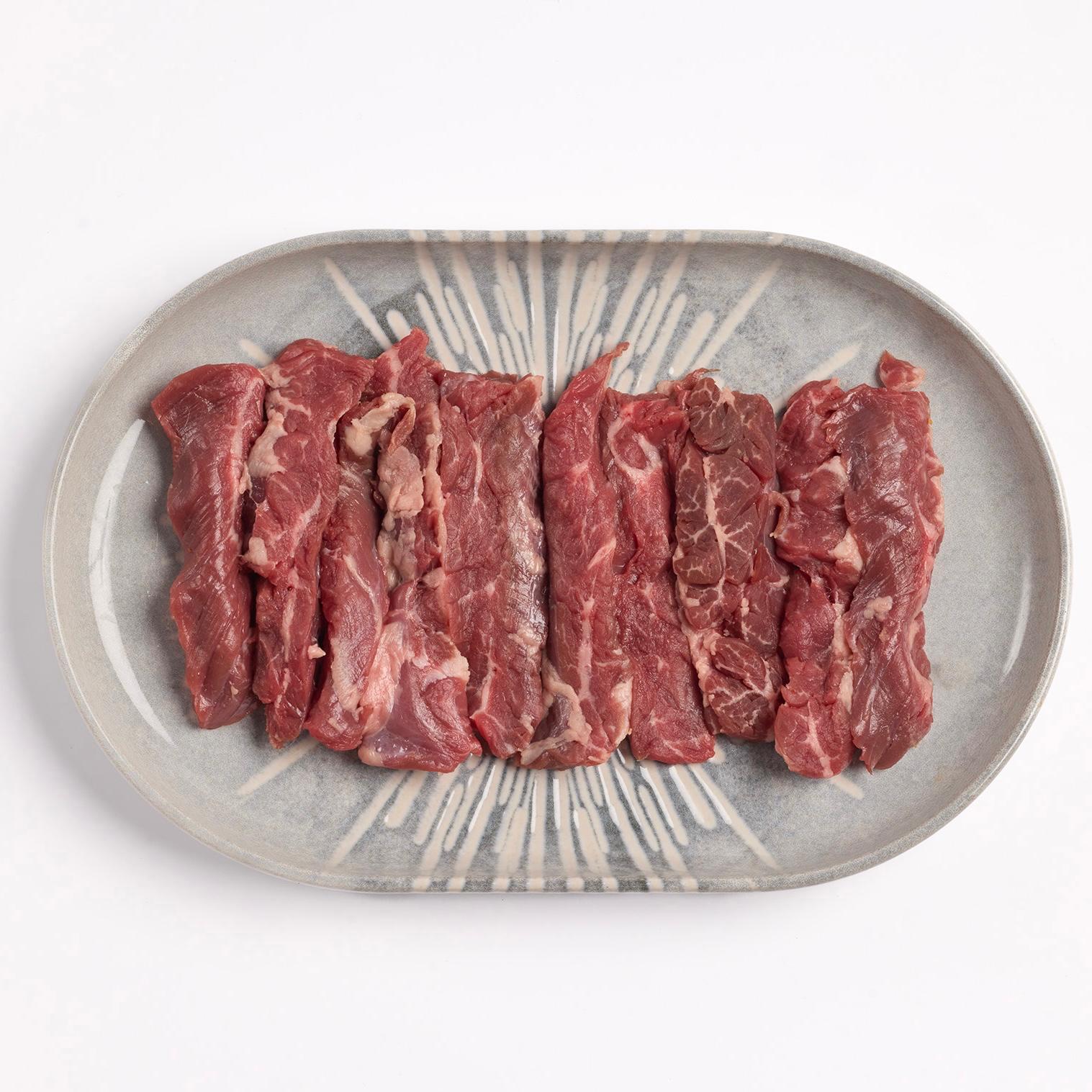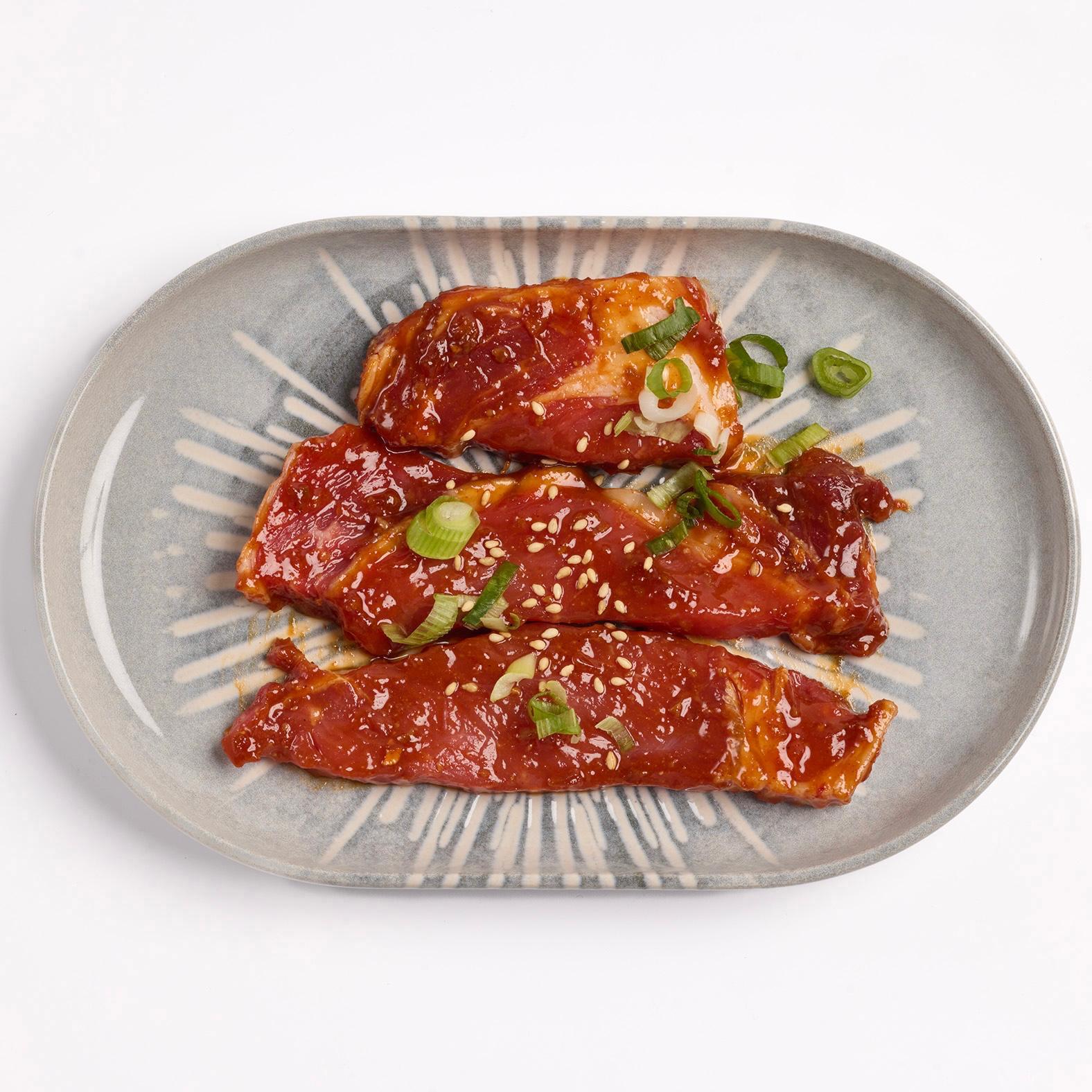 Sabrosa carne de costilla de vacuno deshuesada, marinada en nuestra salsa bulgogi especial y acompañada de rodajas de cebolla.