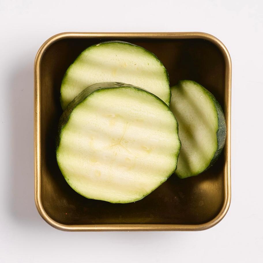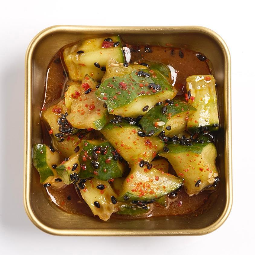 Láminas de pepino fresco, macerado en salsa agripicante con aceite y semillas de sésamo tostado.