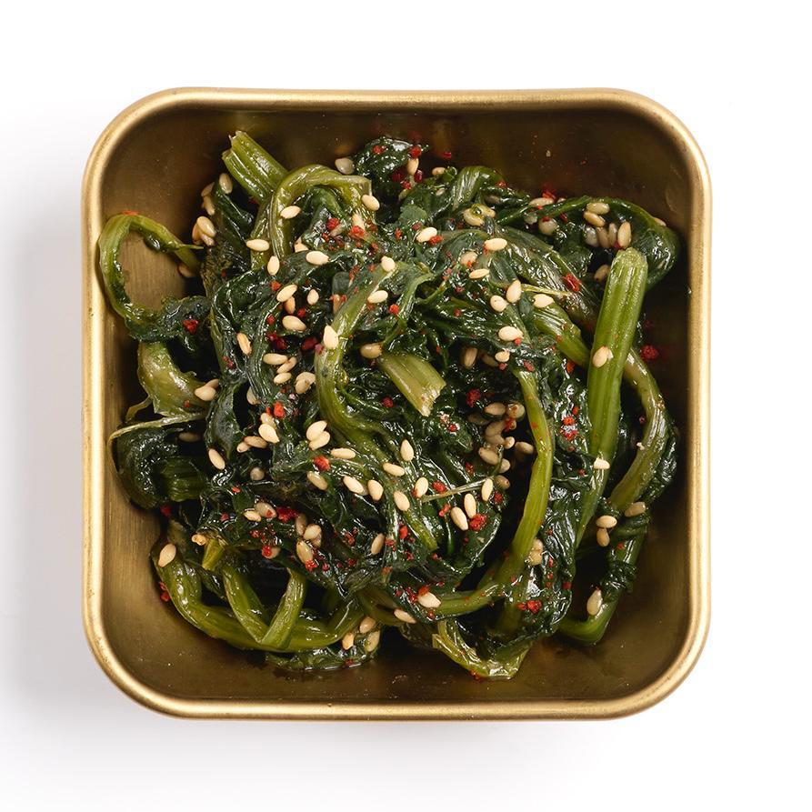 Hojas frescas de espinacas hervidas al vapor marinadas con aceite y semillas de sésamo y miso.