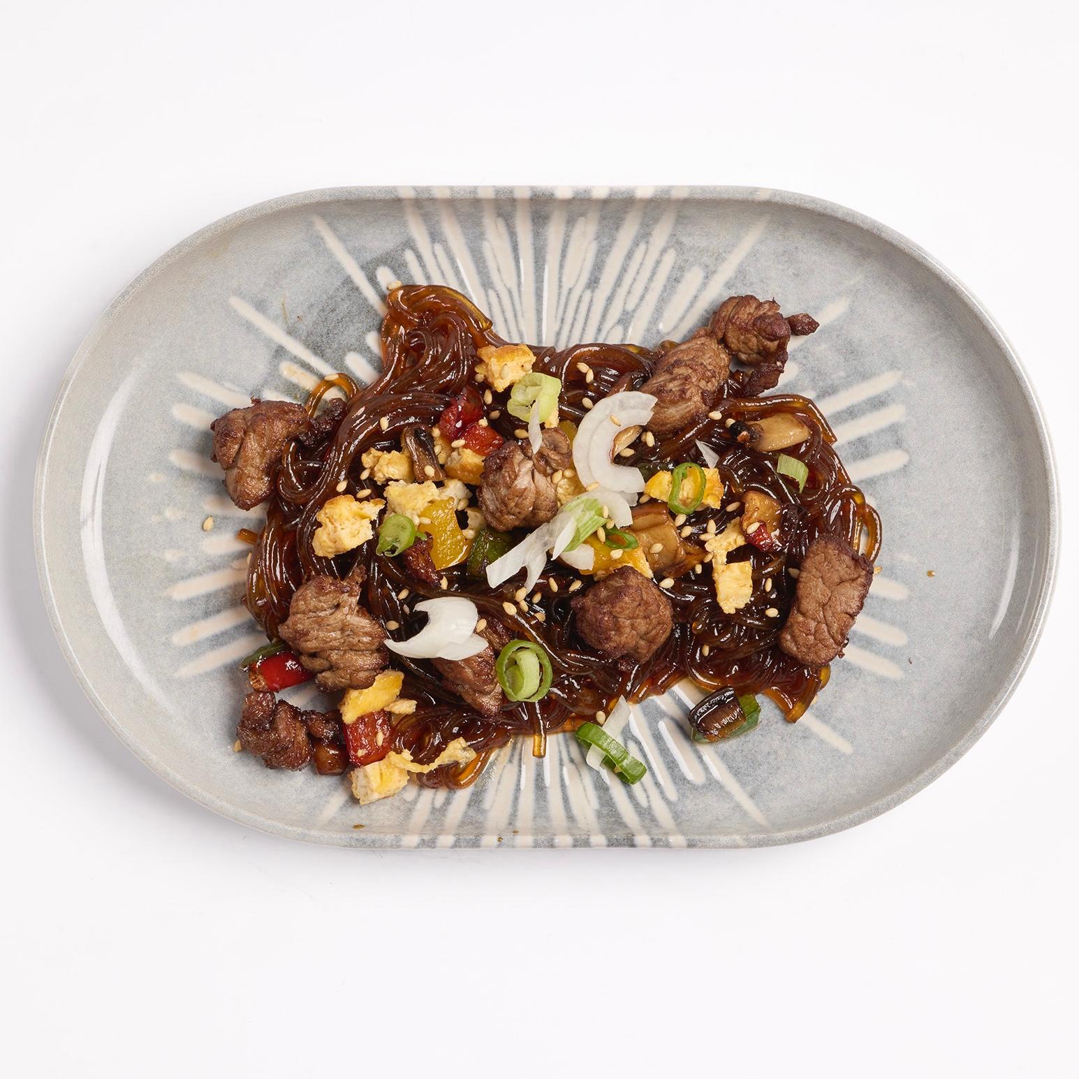 Fideos de boniato transparentes en salsa con tiras de ternera, verduras, champiñones y huevo.