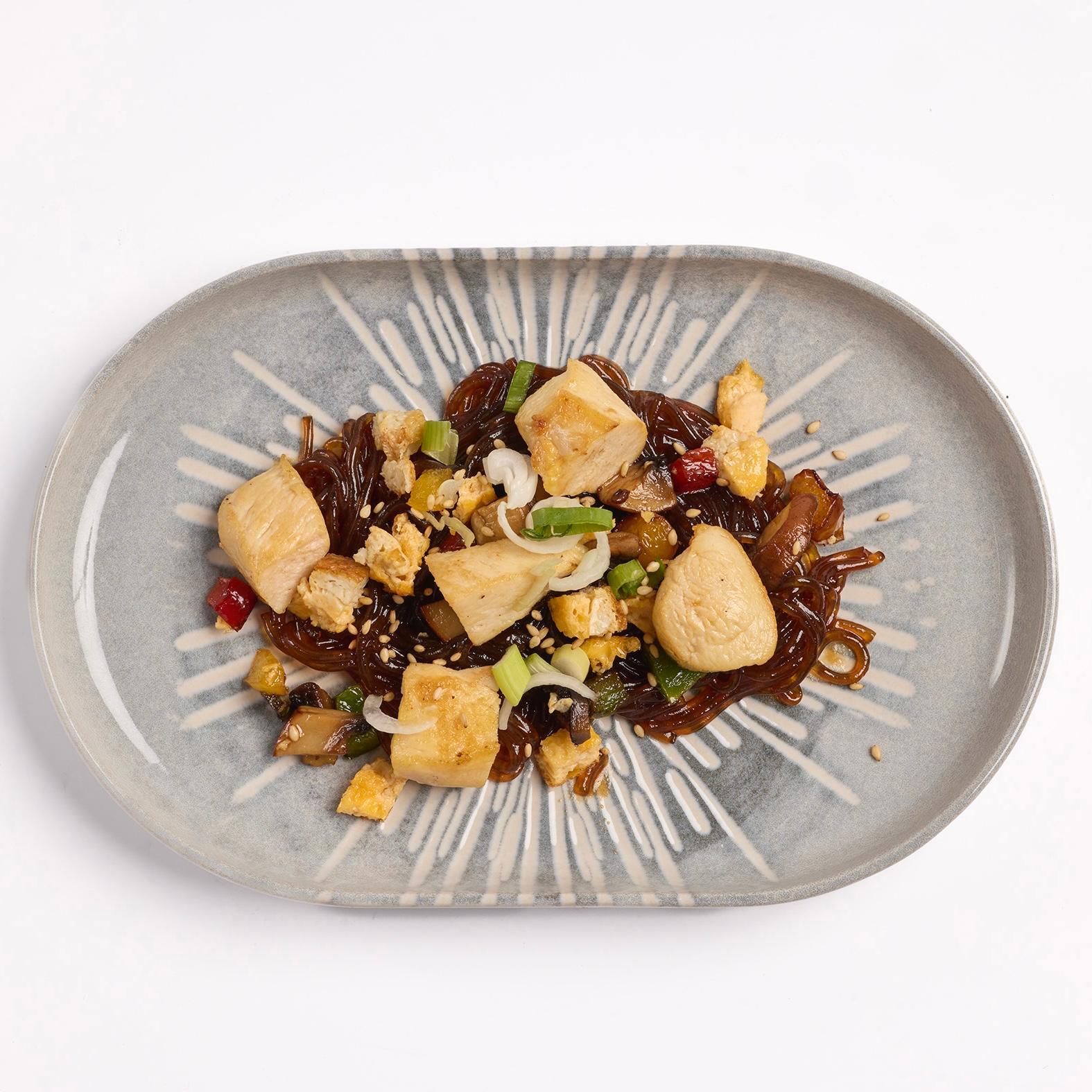 Fideos de boniato transparentes en salsa con tiras de pollo, verduras, champiñones y huevo.