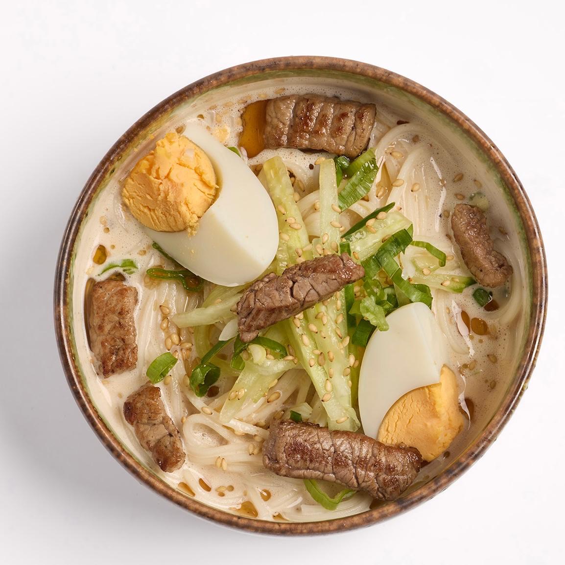 Sopa coreana reconfortante y suculenta con caldo de carne, costilla de vaca y fideos de soba con verduras.