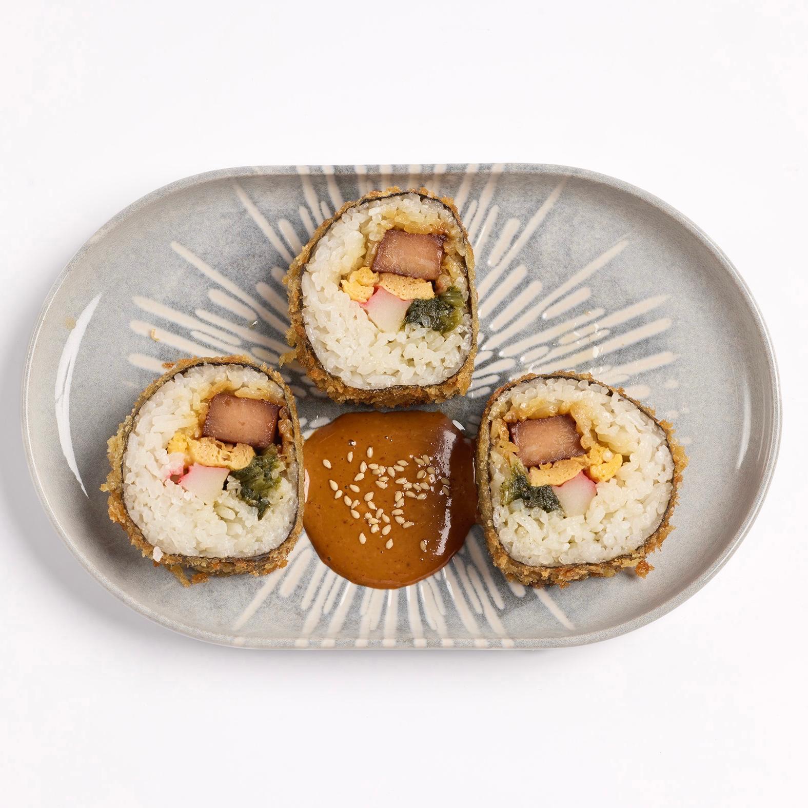 Maki estilo coreano, empanado en panko y frito, relleno de tiras de cerdo asado, cangrejo, huevo y verduras.