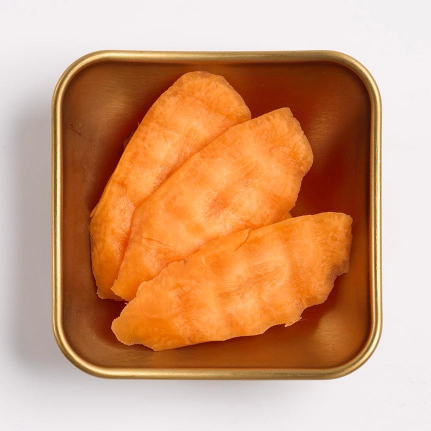 Láminas de boniato morado y naranja crujientes con salsa de sirope de arroz tostado y semillas de sésamo.